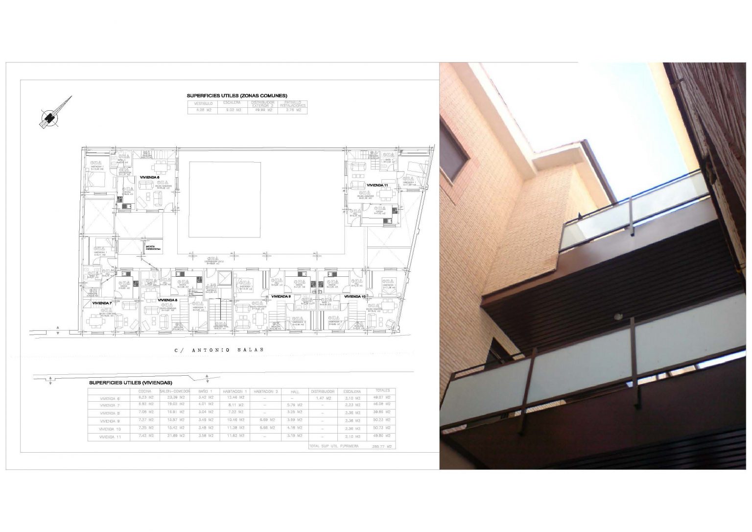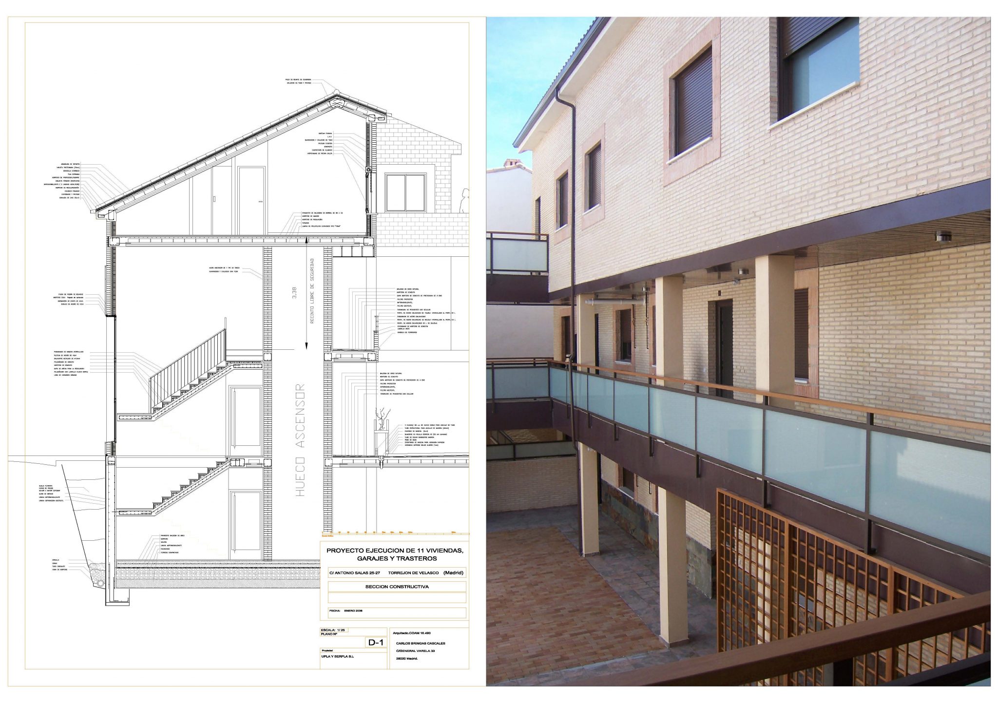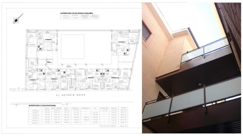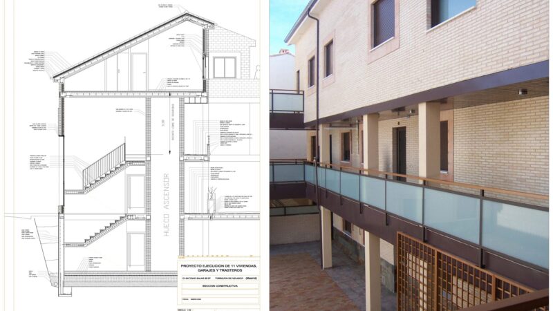 Ejecución de 11 viviendas y garajesen edificio Multifamiliar. Calle Antonio Salas nº 25. Torrejón de Velasco. PROYECTOEjecución de 11 viviendas y garajes en edificio multifamiliarCalle Antonio Salas nº 25. Torrejón de Velasco SUPERFICIE649,39 m2 constr. P. Sótano + 1.060,41m2 constr. P.Baja + P. primera +P. Bajo Cub.ACTUACIÓNTipología de manzana cerrada en forma de UCreación de espacio interior ajardinadoPasillo distribuidor exterior cubierto para acceso a viviendas Imágenes del proyecto