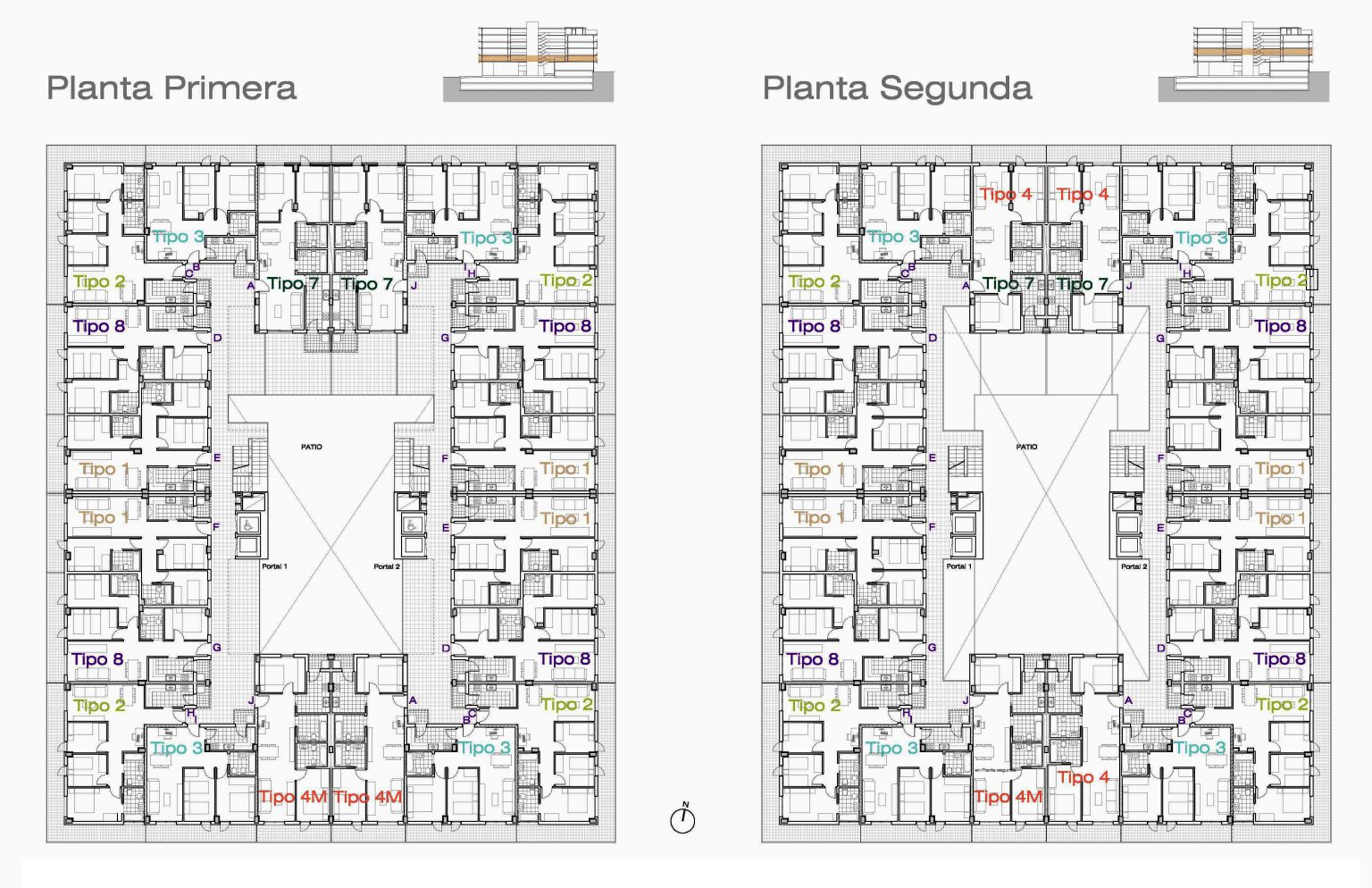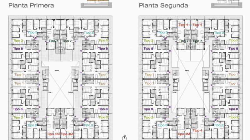 • Manzana  cerrada de PB+5PP con patio central equidistante a 13 m de fachada a calle, correspondiente a 11 m de vivienda y un corredor de 1,75m