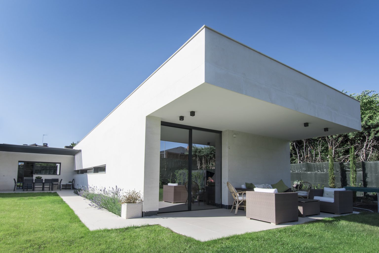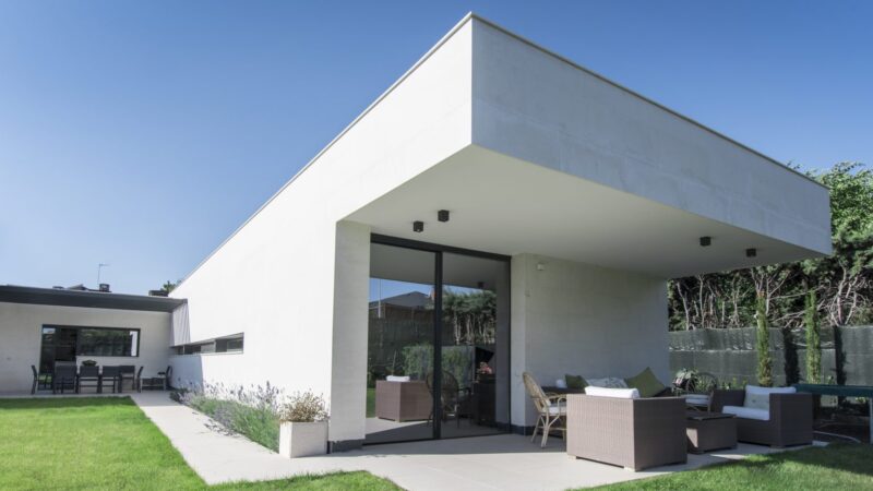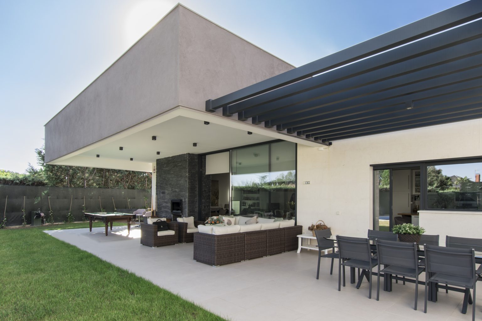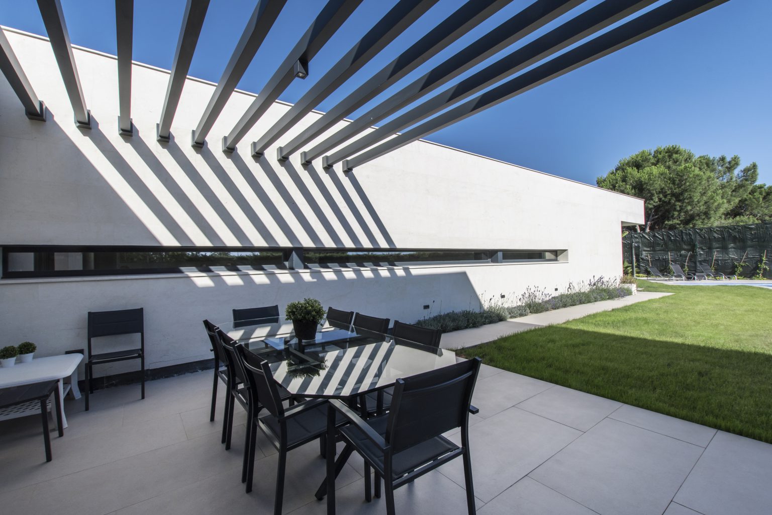 Relación directa de espacio de salón comedor cocina con espacios de jardín exterior